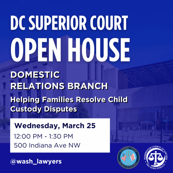 This event is hosted by DC Superior Court and Washington Council of Lawyers, and co-sponsored by the Children’s Law Center and the D.C. Bar Pro Bono Center.